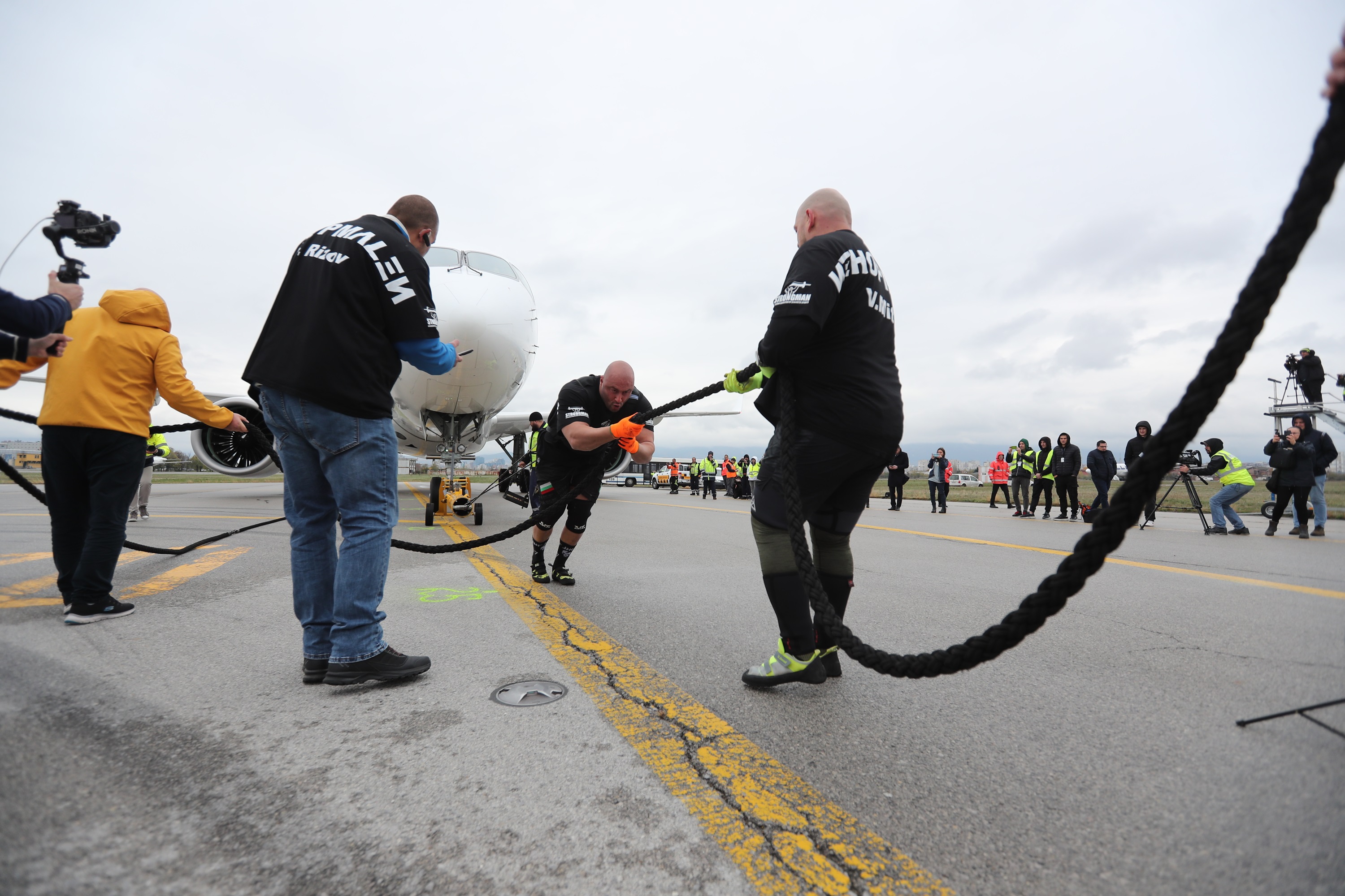За първи път у нас: Двама силови атлети успяха поотделно да изтеглят новия Airbus A220 на „България Еър“