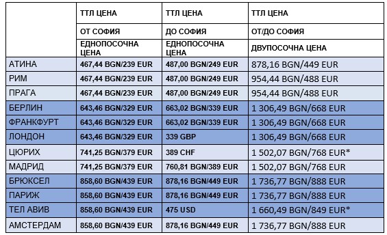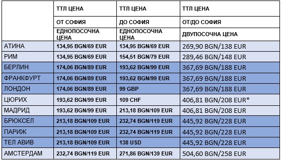 *За двупосочни пътувания Лондон – София – Лондон цената е в GBP, за Цюрих – София – Цюрих в CHF, за Тел Авив – София – Тел Авив в USD.