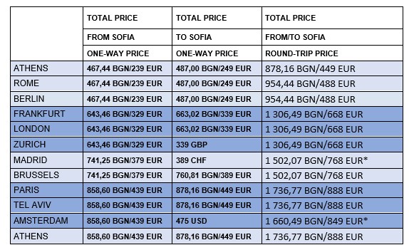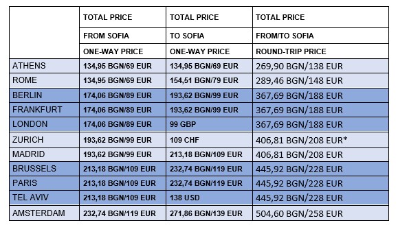 *For round-trip flights London – Sofia – London, the price is in GBP, for Zurich – Sofia – Zurich in CHF, and for Tel Aviv – Sofia – Tel Aviv in USD.